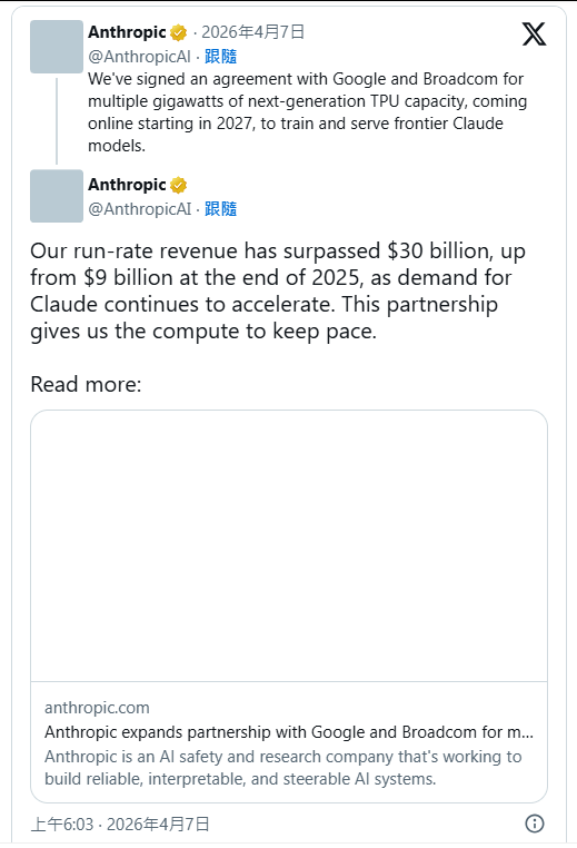相较于 OpenAI 的激进扩张,Claude 系列模型的开发商 Anthropic 走的是一条更受合规与大型企业青睐的稳健路线,其基于“AI 安全优先”的品牌定位,使其佔据了 AI 赛道第二的位置。 这种差异化路线带来的业务增速同样惊人:Anthropic 在今年的年化营收从 2025 年底的 90 亿美元,飙升至 300 亿美元,创下企业软体史上同等规模下最快季度增速纪录。