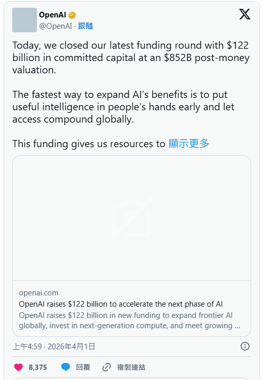 就在 3 月底,OpenAI 刚刚完成了硅谷历史上规模最大的一轮融资——以 8,520 亿美元估值,向 SoftBank、亚马逊、辉达(NVIDIA)、Andreessen Horowitz 等投资方合计募资 1,220 亿美元。其中亚马逊一家投入 500 亿美元,同时綑绑了 1,000 亿美元的 AWS 云端服务消费承诺。